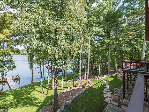 Private 4 plus bedroom 4 bath estate home is situated on 151 ft of sandy frontage on Middle Cullen Lake and is just a minutes from downtown Nisswa. Professionally landscaped lot boasts low elevation, lakeside flagstone fire pit area, stunning lake views and is studded with mature pines. Exceptional home features vaulted knotty pine ceiling, 2 floor to ceiling stone fireplaces, hardwood floors, gourmet kitchen, lakeside sun room, lakeside main floor master bedroom suite and a finished walkout lower level that has a custom wet bar. Attached 3 stall insulated garage has in-floor heat. Detached 3 stall insulated and heated garage has a bunk room above for your guests to stay. Relax in the hot tub or gather with friends on the lakeside deck, patio or around the fire pit under the stars. Take in the warm summer sun on the dock sitting area. Property is right in the heart of the Brainerd Lakes Area close to shopping, championship golf courses, Paul Bunyan trail and numerous dining options.