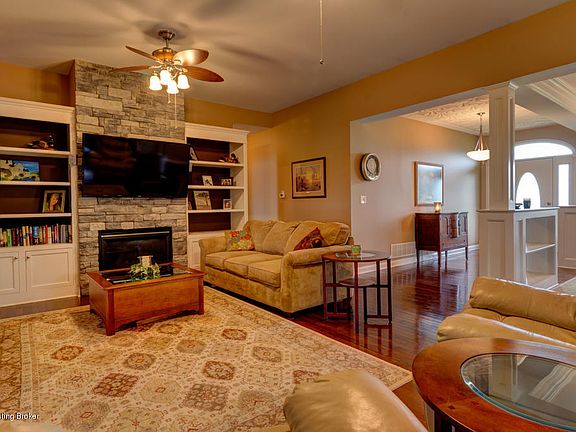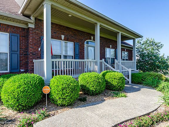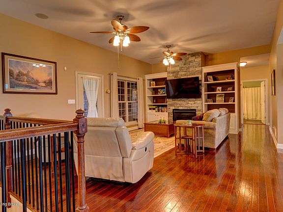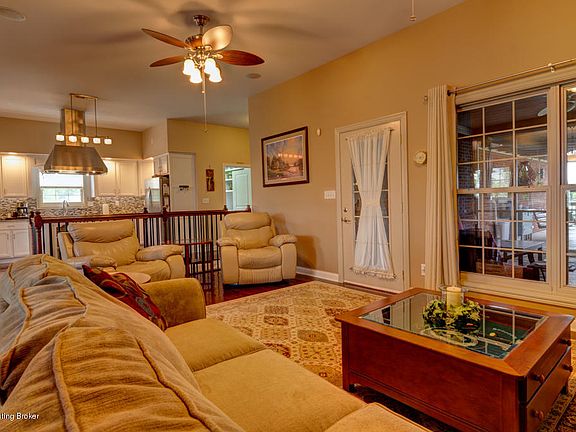 Check out this custom designed walk-out ranch. Country living, not in a subdivision! JUST MINUTES FROM EXIT 18 AT BUCKNER. Popular open floor plan, open kitchen design. Hardwood floors, granite & stainless kitchen appliances, open formal dining room plus breakfast room or possible office. Under house roof screened-in patio, front porch, deck & more! Located just north of the High School & County Country Club, in a rural neighborhood. An attractive front yard welcomes you onto the large front porch. A lead glass front door welcomes you into the open foyer. Beautiful random width mahogany stained cherry flooring runs throughout much of the first floor areas, the foyer, open dining room, into the great room, kitchen & breakfast room.