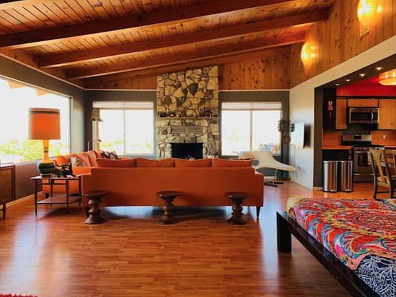 Very popular vacation rental now available on a monthly basis without additional fees. Open plan kitchen and vaulted ceiling living room with large picture windows. House is fully furnished and kitchen is outfitted. Contact me and I'll send the Airbnb listing link or search Airbnb for listing number 119838. Main house is 1454 sq ft 2 bedroom, 2 bathroom. The third bedroom is a detached 270 sq ft studio with its own bathroom. Fully furnished. No pets. Non-smokers. Utilities included to a cap amount that covers average usage. Paved private parking in back of property with concrete driveway.