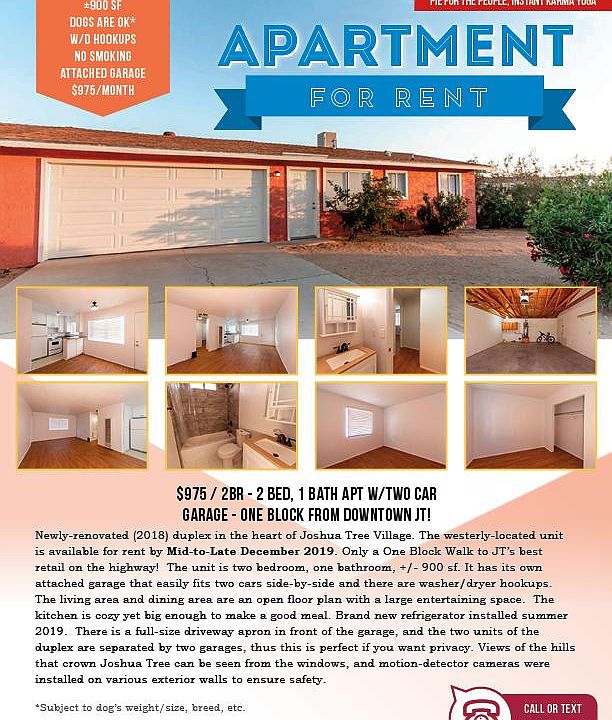 Newly-renovated (2018) duplex in the heart of Joshua Tree Village. The westerly-located unit is available for rent by Mid-to-Late December 2019. Only a One Block Walk to JT's best retail on the highway! The unit is two bedroom, one bathroom, 900 sf. It has its own attached garage that easily fits two cars side-by-side and there are washer/dryer hookups. The living area and dining area are an open floor plan with a large entertaining space. The kitchen is cozy yet big enough to make a good meal. Brand new refrigerator installed summer 2019. There is a full-size driveway apron in front of the garage, and the two units of the duplex are separated by two garages, thus this is perfect if you want privacy. Views of the hills that crown Joshua Tree can be seen from the windows, and motion-detector cameras were installed on various exterior walls to ensure safety.