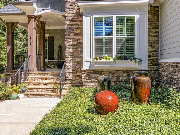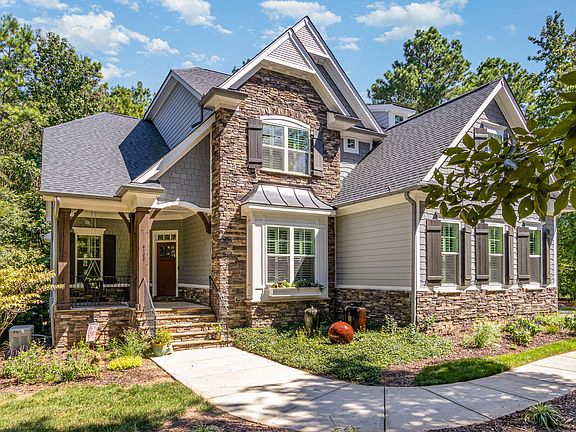 Welcome to this exceptional custom home in the Dunhill neighborhood of Chapel Hill, set on a 2.4 acre, park-like lot with direct access to Johnston Mill Nature Preserve and miles of scenic hiking trails.This stunning David Weekley community offers luxurious, large-lot residences and peaceful, high-end living. A beautiful front porch with a swing invites you into a two-story foyer with a formal dining room and dedicated home office. The open floor plan features newly-finished hardwood floors, a spacious living room with vaulted ceilings, a 2-story stone fireplace, and custom built-ins. The modern kitchen offers quartz countertops, stainless steel appliances, custom cabinetry, large walk-in pantry, butler pantry, and a large island perfect for entertaining. The first-floor primary suite includes an accent wall, walk-in closet, and a spa-like bath with dual vanities, a soaking tub, and a custom walk-in shower with dual shower heads. The primary bedroom has direct access to lounging deck with hot tub. Upstairs boasts three bedrooms, two full baths, and a versatile flex space ideal for a home gym, playroom, or media room. Enjoy year-round entertaining on the expansive screened-in porch overlooking the fenced backyard. The screened-porch feels like a treehouse retreat, elevated above the landscape and featuring a floor-to-ceiling wood-burning fireplace perfect for cozy evenings or entertaining guests year-round. Other highlights include a whole-home generator and generous storage/workshop space beneath the porch. Just 15 minutes to Duke University and UNC-Chapel Hill (no I-40 commute) and 20 minutes to RDU Airport, this home offers unmatched convenience to shops, dining, and medical centers while providing the privacy and tranquility of a nature preserve setting. This Dunhill gem is truly a rare find!