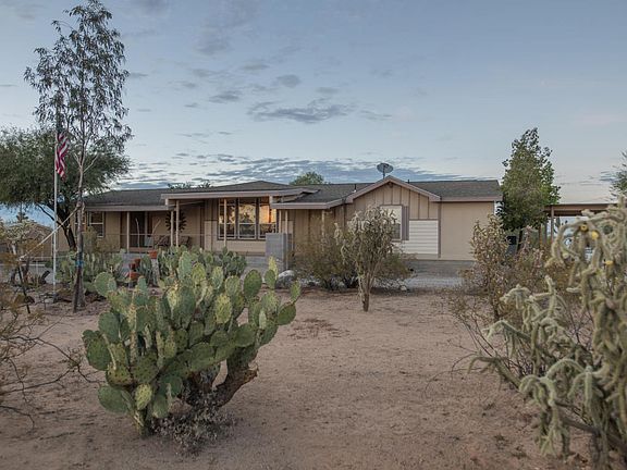 Spectacular!! Newer spacious great room design offers 3 bedroom plus den and is situated on a flat / fenced 1.2 acre lot with mature desert landscape, solar electronic gate entry, new HVAC and dual pane windows, 6 car carports and covered RV storage, work shop and extra storage units. Extra large kitchen with island, lots of counter space, cabinets throughout are newer Knotty Alder and plentiful. Fantastic block skirting, 2 full length patios, and sitting areas to enjoy the serenity and views!