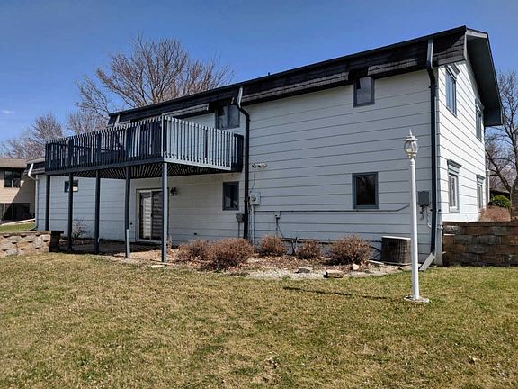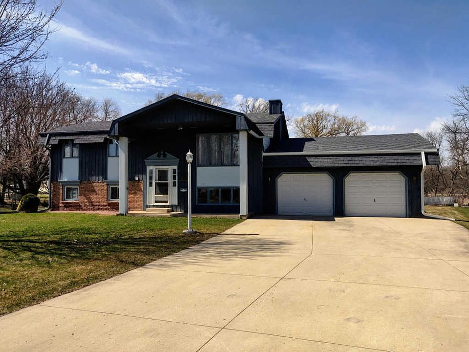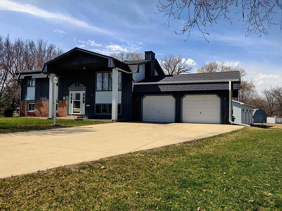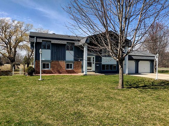 Large lot for this 4 bedroom, 2 bath house in town. 0.56 acres. Lots of outbuildings. Attached 2 car garage, and detached oversized 3 car garage that has recently been fully insulated with gas heater installed. 1,512 total garage square feet! Also includes a machine shed, storage shed, and gazebo. Split level home includes: 2 bedrooms and a bathroom on each level, basement walk-out, stainless appliances in kitchen, washer and dryer, and wood and tile floors. Willow trees lining the back boundary of the property. No neighbors through the back of the property, instead is a stream and Meadow Park.
