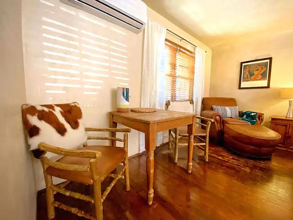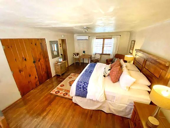 A restored early 1930's Adobe Casita located in the beautiful South Capital neighborhood in the City Different! Furnished with a rustic bohemian vibe, king size bed, a fully stocked kitchen, wireless internet, smart TV where you can log in to your favorite tv streaming apps, private parking, and your own personal patio. Studio apartment for rent. Fully furnished. $2200 rent with $500 deposit. 3 months maximum. Heating and cooling, washer and dryer on site. Owner pays utilities. Cleaning fee of $150. No pets. Please TEXT OR EMAIL Natalie at Little Adobe if interested.