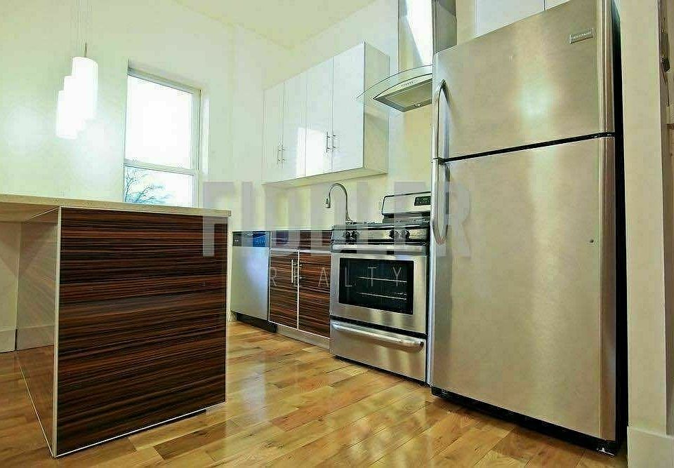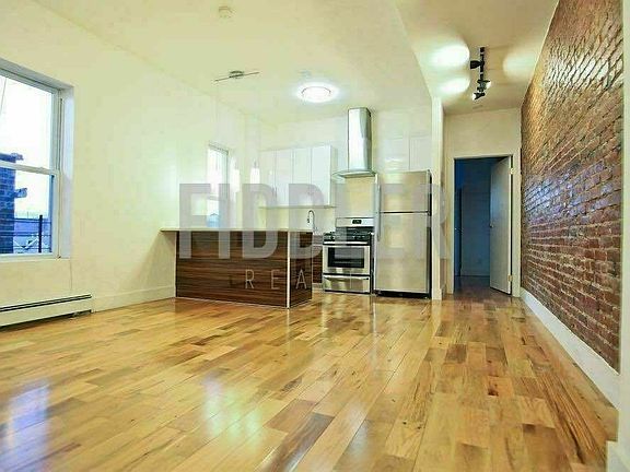 Pre-war building in prime Bed-Stuy offering renovated huge 1 bedroom apt. for 7/15 move in! At no fee! 4th floor walk up Apt. features: Modern kitchen with Stainless Steel appliances Great sized bedroom with window and large closet Huge sunny living space Full wall of exposed brick Track lighting New hardwood floors throughout Gut renovated bathroom High ceilings