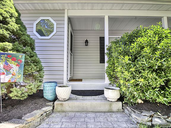 Man can't duplicate what Mother Nature creates & it becomes evident here as she has created a serene backdrop for this inviting colonial tucked away on a cul de sac backing to preserved woodlands.A rare find is this charmer, from the rocking chair front porch; stone front gas fireplace; spacious owner's suite w/ WIC & full bath; water filtration system; finished basement w/ custom built bar & rec room; stamped concrete walkways & patio and a plush lawn feed by 4 zoned sprinklers.The backyard extended living space sets the stage for entertaining or simply being immersed by Mother Nature's hugs, offering a covered pergola and spa inspired hot tub with views of your own slice tranquility here at the Jersey shore.