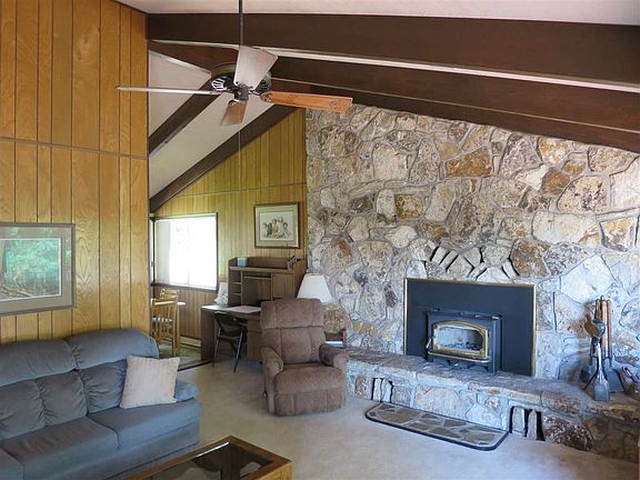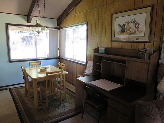 This cozy but spacious cabin has been well maintained and offers little peaks of the lake! Two separate living rooms, each with a wood stove, make it possible for everyone to spread out. The private deck has the perfect southeastern exposure and even offers a hot tub. Multiple garages make it easy to store all of the toys. The fenced front yard has rose bushes and gardening possibilities. Three full bedrooms plus three full bathrooms and located on a quiet access road away from the traffic. A perfect spot in the woods!