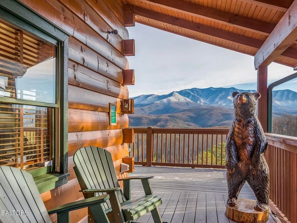 Mountain Majesty at its finest... A house with so many interior features and exterior amenities doesn't need to be in such a perfect location, but this appealing log cabin, less than 5 mi from downtown Gatlinburg, checks all the boxes. As you step through the doors of this meticulously maintained mountain cabin, you instantly feel at home. Upon entering, you walk into the spacious great room with vaulted ceilings, exposed beams and a stacked stone gas log fireplace. Just a few steps away is the kitchen and dining area. The beautifully updated black granite countertops highlight the oak cabinetry and kitchen island. This open floor plan makes it a perfect place to entertain and enjoy time with family and friends. Whether you choose to spend your time inside this luxurious home or outside on the spacious covered front deck, there will never be a lack of views to Mt. Leconte and the Great Smoky National Park. The main floor of the home features 2 queen bedrooms. As you continue up to the open loft you are greeted with a comfortable leather sectional, high top gaming table, as well as a shuffleboard table. All of this leads out to an additional covered deck complete with a porch swing and a hot tub for relaxing and enjoying the fresh air and abundant mountain views. The large private primary bedroom with en suite bath is located on this level as well. Both bathrooms in this cabin have been recently renovated to include granite countertops and tiled showers with glass enclosures. What really makes this mountain cabin so special is not just the views and location, it is how thoughtfully appointed the furniture and décor are that make it feel like you never want to leave. Read the 285 5 star reviews on VRBO. https://www.vrbo.com/815408