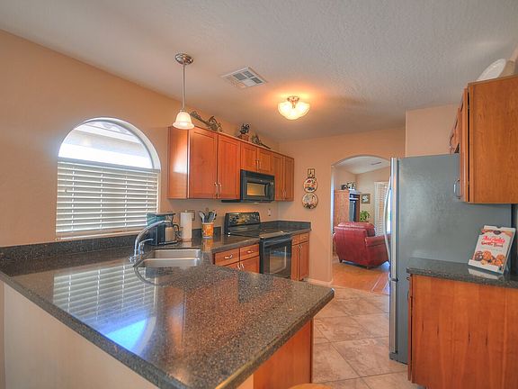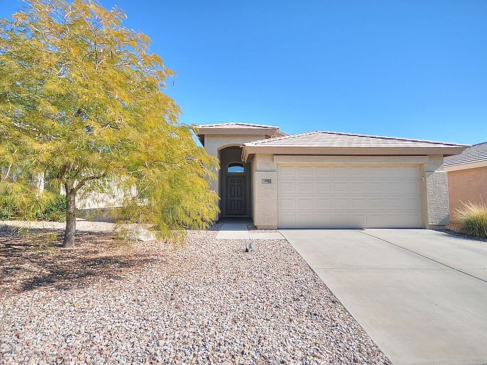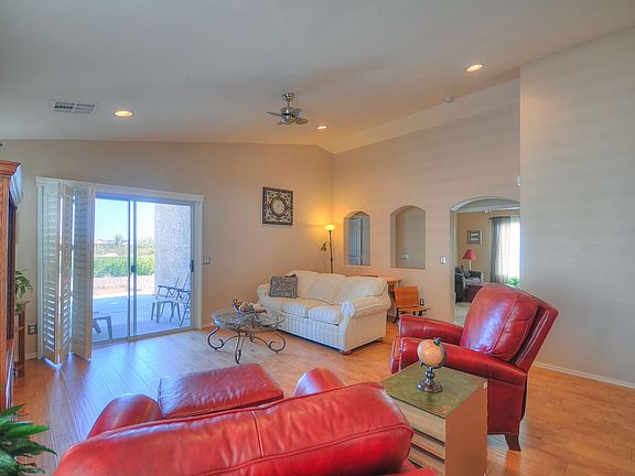 Sip your morning coffee on this east facing rear patio and watch the sun rise over the double fairway. In the evenings entertain your friends in comfort away from the afternoon Arizona heat. This 2 br, 1.75 bath, 1443 sf home features brand new natural cherry hardwood floors. The kitchen has cultured stone countertops and cherry cabinets. Baths have comfort heights toilets and counter. Updated lighting in 2015. The oversized garage will hold all your toys and has built in cabinets. Vaulted ceiling and two bay windows. This home is move in ready. Nothing to do but relax. Included is also 18 month prepaid HVAC/plumbing maintenance agreement. CFD paid in full.