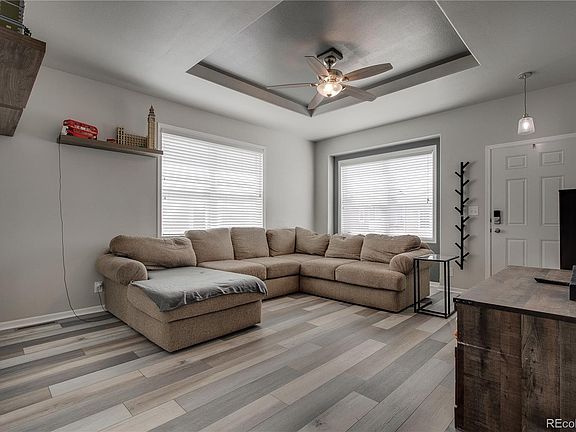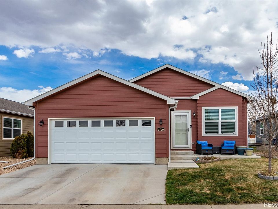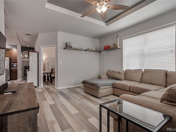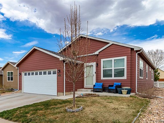 Don't miss this beautiful, move-in ready home! Built in 2017, this 3 Bedroom/2 Bath home has been updated with so many extras. The newer hard surface flooring throughout the home is beautiful and so easy to maintain. The kitchen backsplash was updated to coordinate with the new flooring. The lighting has been updated throughout and ceiling fans added. Cabinets have been built into the laundry room for extra storage. A collapsible folding table provides a convenient space to fold your clothes. Storm doors have been added to both the front and side doors. Extra storage was added in the garage with pull-down ladder access. The tall ceilings offer a spacious feel. This home is truly move-in ready with window coverings in place and the white picket fence installed. The Seller will even include the kitchen island and buffet if the Buyer wants them. Easy commute to I-25 or Hwy-85. Shopping, restaurants, coffee, and gas all within minutes of this great location. The Seller will even include the kitchen island and buffet if the Buyer wants them. Prairie Greens is a land lease community. The land lease currently has a monthly fee of $715 and includes lease of land, road maintenance, street snow removal, clubhouse, fitness center, outdoor pool, play & ground/park.