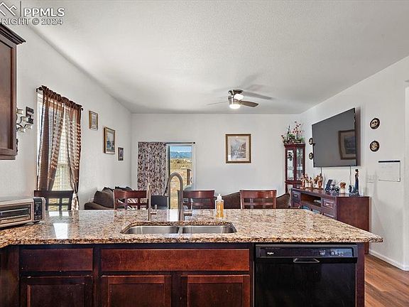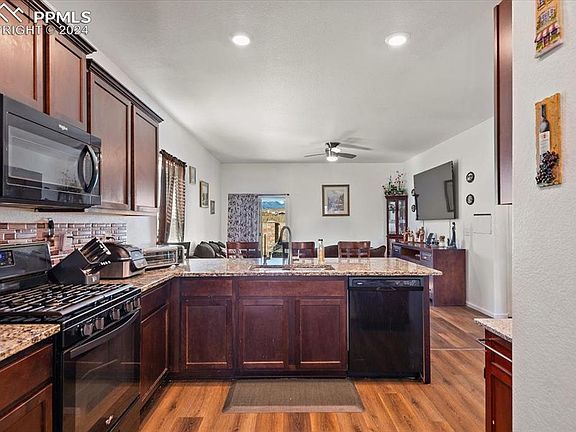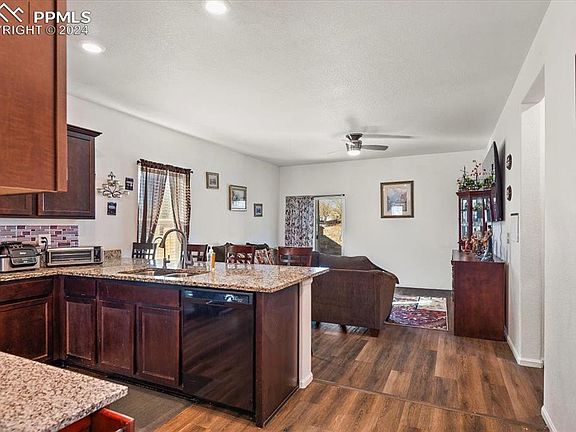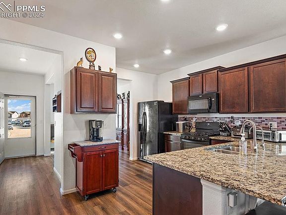 WELCOME HOME to this beautiful main level living ranch home! The kitchen features all appliances including gas range, granite countertops with counter bar and opens to living room with walk out to back yard with great mountain views, including Pikes Peak. You will also find separate dining area off kitchen, this living space also features easy to care LVP flooring. Down the hall is the master bedroom with adjoined bath with granite counters and walk in closet, there are 2 additional bedrooms and a full bath. This home is conveniently located to schools, parks, walking trails, shopping restaurants, easy access to I25 and a short commute to Fort Carson and Peterson AFB. Don't miss this great home, call for your private showing today!