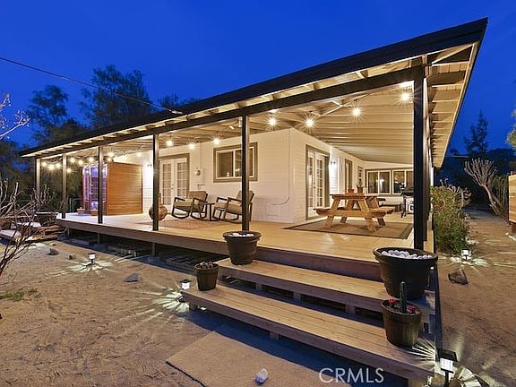 Minutes from the town’s village and to the National Park lies this spectacular, furnished, renovated Boho Bungalow. Rejuvenate & detoxify in this desert oasis, paradise decked with stock tank, hot tub, and outdoor shower for ultimate relaxation. At night, gaze upon the dazzling stars in hammocks or sit around the fire pit. Upon entering this home you will find locally sourced Joshua Tree artisan decor, vintage pieces, a swinging chair, cozy fur accents, and outdoor elements in every corner. Step down into the light & bright living room, lined by oversized windows and full of thoughtful amenities. The room is completed with a plush couch, record player, Apple TV, and dining table for 4. surrounded by views of the Joshua Tree mountains & rock formations off in the distance. A fully-equipped kitchen, where you can prepare home-cooked meals, stainless steel gas range with an ample supply of cookware. You'll have two great places to enjoy your meal, either at the table in the living room or outside at the picnic bench on the wrap around porch. The master bedroom features French doors that lead outside to the porch, a king-sized bed, and an attached bathroom. The bathroom features upgraded amenities, such as a Jacuzzi bathtub, vanity lighting. Two additional secondary bedrooms with one offering direct access to the patio, a queen-size bed & spacious closet. Third bedroom has a full-size day bed with an additional pull-out trundle bed underneath, a walk-in closet. The outdoor amenities include a stock tank, an outdoor spa/jacuzzi, a beautiful handmade outdoor shower, fire pit with seating, and 3 large hammocks. Ultra-trendy strand lights line the deck at night, making it the perfect spot to spend warm evenings. With all the lights off, you can view the stars above! Parking is easy on the long driveway. Down the street is the entrance to Joshua Tree National Park.