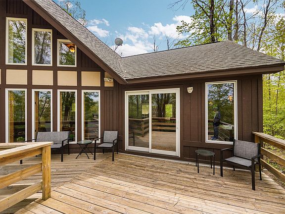 Stunning chalet in scenic Lakes of the North. 3-bed/2-bath with main-level primary suite, newly designed kitchen, and renovated bathrooms offer a clean, updated feel. This open design showcases beautiful real-wood flooring & knotty pine tongue and groove for that 'up-north' feel. Finished walk-out basement with two non-conforming bedrooms and a sauna is perfect for guests or additional storage. Enjoy watching wildlife from the wrap-around deck overlooking the natural Greenbelt of Lake Harold. Amenities include access to Pencil Lake, Lake Harold and Deer Lake, a clubhouse with a water park, cross-country ski trails, campground & much more. Nestled in the heart of snowmobile country, this retreat is ideal for relaxation and adventure. Embrace the peaceful lifestyle in this idyllic setting.
