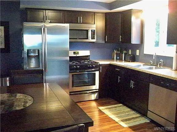 This is it! Bright, clean and beautifully updated throughout! Liv rm w/ cathedral ceiling & lg bow window; pretty view of open fields. Kit has espresso fin cabinetry, stainless dishwasher & microwave, laminate flooring; half wall open onto liv rm. Bath has updated fixtures, glass vessel sink and unique waterfall faucet. Deck overlooks rear yd backing up to woods. Country feel location, min to I-990 and all conveniences; Starpoint schools! Updates since 2011: complete kit and bath remodel, carpets in liv rm & 2 bdrms, extra wide concrete drive, 6 panel doors, light fixtures & ceiling fans.