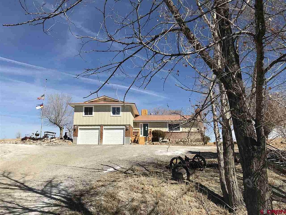 Quiet 40 acres with exceptional surrounding views of San Juans, Black Canyon, and Grand Mesa, no covenants, and irrgation water. Large tri-level home provides multiple living areas including a main living room with woodstove insert, a family room plus an additional finshed basement! Three spacious bedrooms upstairs with an additional non-conforming bedroom (no closet or egress) in basement. Updated kitchen offers a large center island with range top and hood, granite countertops, tiled backspash, wall oven and microwave, stainless refrigerator. Bright dining area with silding glass door to back patio. Two full baths with tiled tub/showers and decorative sinks and facets. New, easily maintained laminate floors throughout with tiled kitchen and dining. Large laundry room with sink plus an extra storage room in basement. New porch matching back deck accessed from master bedroom sliding door. Two-car attached garage and room for R/V and all your other outdoor toys! Huge yard on sprinkler system with garden area, apple and peach trees, strawberry and blackberries. Shed and fenced area with room for animals and with 40 acres plenty of space for any of your additional needs! Located off paved road just 2 miles east of Hwy 50.