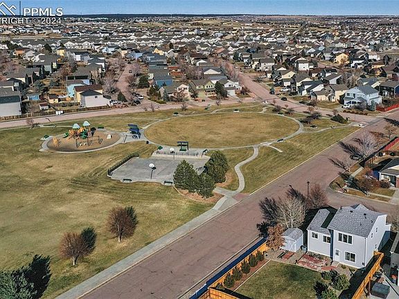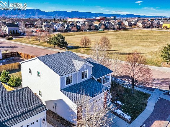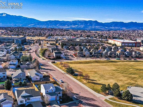 Welcome home to this light-filled floor plan on a corner lot with OUTSTANDING views of Pikes Peak and the front range from nearly every room to include the primary bedroom, kitchen and family room. You won't get tired of taking in these views where you'll be able to see the fireworks that are set off on top of Pikes Peak. You'll have first row seats from within the comfort of your very own home! And just across the street, you'll find Snowy River Park, which is a level, large, beautifully manicured park complete with basketball court and playground. If you have children or pets, although the beautiful, fenced yard is already perfect for them, the adjacent park just gives them even more room to explore or for you to have plenty of space for large family picnics and gatherings. Inside this beautifully maintained home, you'll find plenty of space to include a living room, family room and a large room downstairs at garden level. Let your imagination run wild with this room to include turning it into an exercise room, office, second family room or a movie-theatre room. Off the family room, you'll enjoy the walk-out to the level backyard complete with a large storage shed, spacious concrete patio area and a brand-new fence. And this fence isn't going anywhere. The workmanship is incredible! Vaulted ceilings in the living room, dining area, kitchen and primary bedroom bring a feeling of openness. In the primary bedroom, you'll enjoy two closets, so you won't have to argue over space. The roof and all the bathroom windows are less than 10 years old. Stop by for a showing today, and you'll be pleasantly surprised at what your money will buy with this beautiful home located in a desirable, convenient neighborhood close to shopping areas, Peterson Space Force Base, and the Powers corridor. Don't miss your opportunity to own this gem!