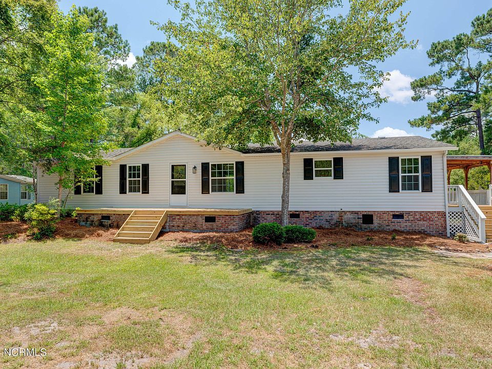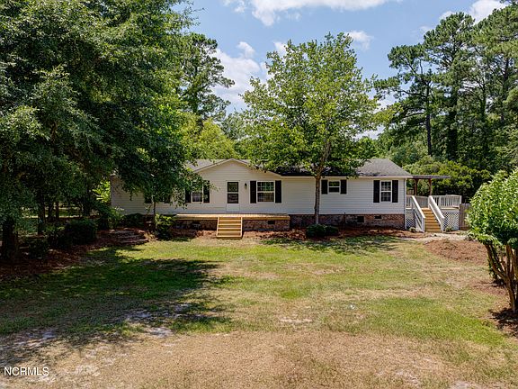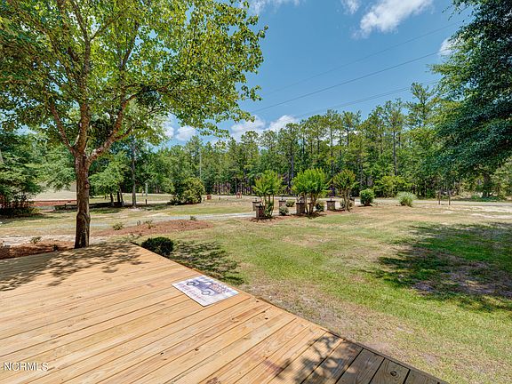 Step outside through the brand new sliding glass doors where an expansive 42x12 wrap-around deck awaits, including an additional covered 15x10 area, perfect for outdoor relaxation and entertaining year round. You will find access below the deck for additional storage. This home also includes seamless gutters at the front and back for low-maintenance living, and the vinyl siding along the front of the home has also been replaced. Additionally, there is a wired 23x11 barn shed with loft space, ideal for extra storage needs or could also function as an office, studio.. you choose! Located just 1 mile from Holly Shelter Boat Ramp, you'll have direct access to the Cape Fear River. Enjoy the convenience of being only 25 minutes from Wilmington, free from city taxes and no HOA fees!