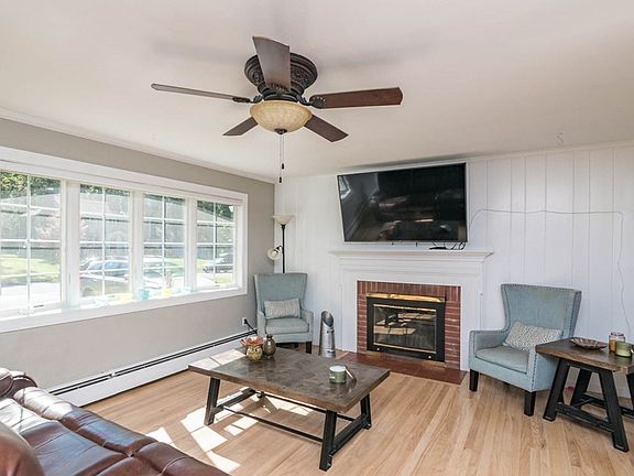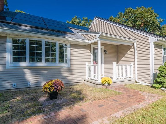 Price improvement makes this lovely updated Cape even better! Brick pathway leads you from the front porch into a bright & light living room featuring crown molding, fireplace, bow window & wood floors, eat-in kitchen w/ crown molding, granite counters & center island, & French door leading into a three-season sunroom/porch or take the slider out to a multi-level deck, above ground pool, & spacious fenced-in yard for entertaining or relaxing. Main bedroom w/ dual closets, wood floors, & en suite bath w/ shower. Two other bedrooms w/ wood floors, & full bath complete the main level. Upstairs features a bedroom w/ wall-to-wall & a room perfect for home office/remote learning space. Bring your ideas to the partially finished basement. Seller states updates include newer boiler, new sump pump, new sand filter for pool, & interior painting & refinishing of wood floors (w/in last 2 yrs). Leased solar panels. Many major services w/in 2 miles & town access to 91. Take a peek & fall in love!