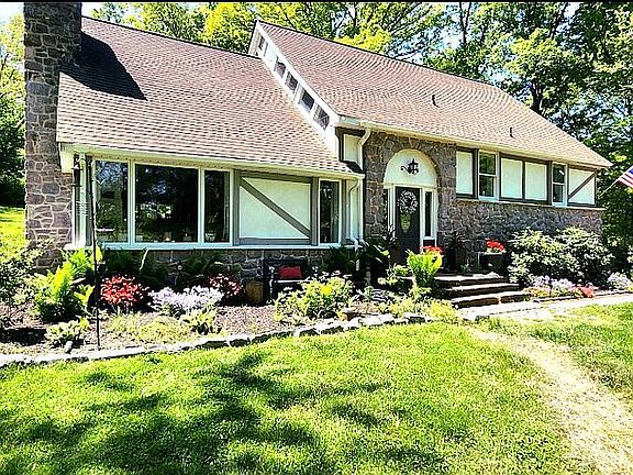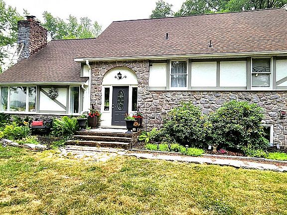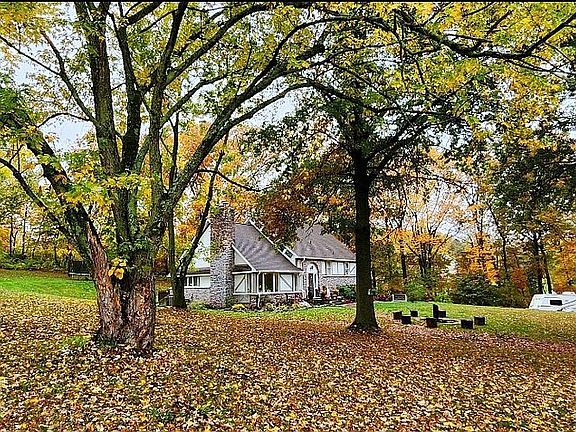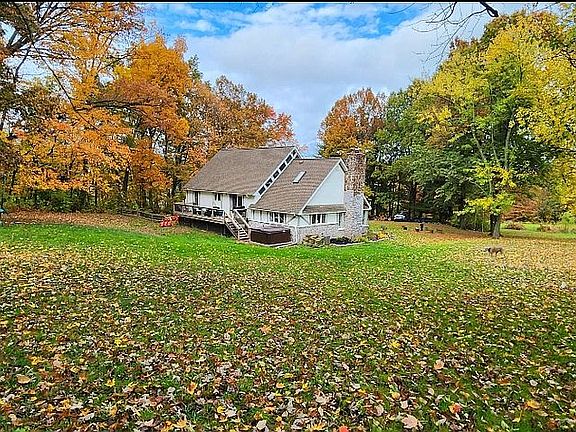 Split level Tudor style home located on 3 scenic acres. Open floor plan with exposed beams and trusses.. Bright and airy feeling. 2 bedrooms located on 2nd floor with an additional large playroom/den. 2 bedrooms located on first floor. Updated wood burning furnace and Oil tank. Large 1,600 sq. ft. garage/basement with work shop, furnace room and 2 car parking.