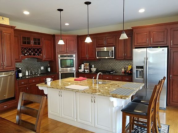 Wonderful Colonial set on almost an acre of land. Many inviting spaces from the covered front porch, to the back deck to the beautifully designed fire-pit area. This home boasts 4 bedrooms and 3 1/2 baths. 10' ceilings on the wide-open 1st floor provide great space for family meals and entertaining. The kitchen is a dream and includes so many extra touches: in-cabinet spice rack, wine rack, pan storage, double ovens, second sink in granite topped island, gas range, stainless appliances and gorgeous backsplash. French doors lead out to a deck, expanding the living/entertainment possibilities. The living room offers a gas fireplace and is large enough to accommodate your furniture and pool table (negotiable)!! The 2nd floor also offers 10' ceilings (vaulted master suite), 4 bedrooms, 2 full baths and a laundry area. The lower level was completed by the builder for the current owner. This special space is ADA assessible by a ramp from the driveway. French doors fully open for ease of entrance into a beautifully designed studio space offering: living/dining space, bedroom area, full bath, laundry area (washer incl.) and loads of storage. The kitchen area includes a refrigerator and sink (granite counter is roll-under height). The bath contains a roll-in shower. There are so many possibilities for you to make best use of this space.