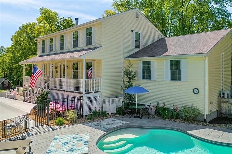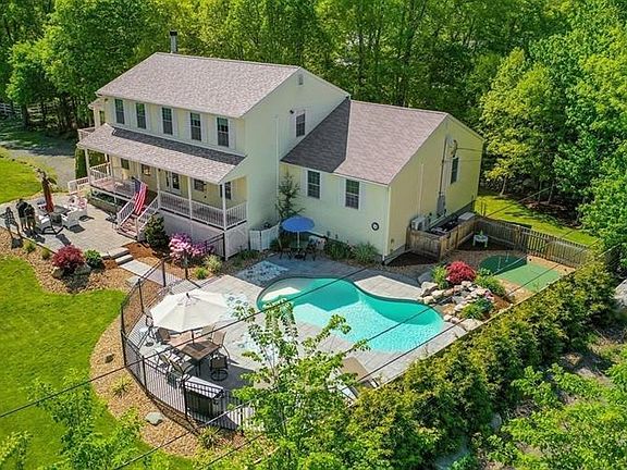 Country living with equestrian pleasure. 4000 + square foot home with space to relax. This home offers an open floor plan with over sized kitchen and eating area, fireplace dining room, living room, vaulted ceiling family room with a wet bar, full front farmers porch, rear deck with hot tub, partial finished basement. 5 bathrooms including private master bath.1s't floor master bedroom and 3 additional bedrooms. There is also a legal in-law residence that can easily be incorporated into single family. Outside find a beautiful gunite pool with finished patio and lounge area and cabana for pool use. 4 stall barn and tack rm and there is an additional 2 stall barn. 2 paddocks on sight with license for 9 Horses. In addition this home has a back up generator for power outages. New 50 year roof. 7 zone air conditioning. In home office. All this and much more not mentioned here. This farm home is a must see. built for a total zest for life, live in and love it.