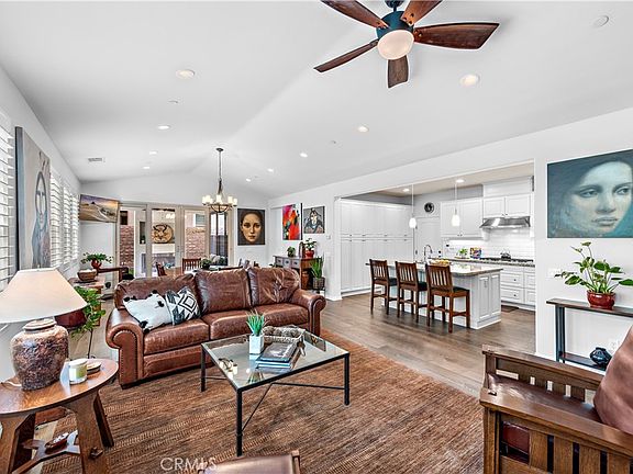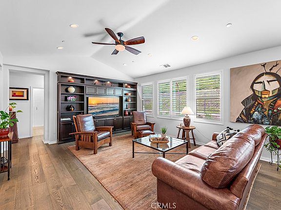 Charming, highly upgraded home nestled in the 55+ Avocet neighborhood of Rancho Mission Viejo. This well designed floorplan flows beautifully and lives like a single story with a Primary suite and 2 secondary bedrooms at separate ends of the home and the great room, outdoor room and kitchen in the heart of the home. Also a bonus room and powder bathroom are on the second floor which is perfect for an office, media room or additional guest suite. Luxury upgrades include distressed wood floors, custom media built-in at the Great Room with storage and lighting, plantation shutters throughout, 2 custom barn doors and $30,000 worth of California Closets built-ins including custom L desk and work station with murphy bed in Bedroom 1 and closet built-ins in the Primary. Kitchen with beautiful white cabinetry, striking glass pendants, granite island and countertops, and lovely backsplash. Spacious master suite with ceiling fan, plantation shutters, walk-in closet with built-ins, and custom white barn door leads to the spa bathroom with quartz countertops, mosaic style custom backsplash, luxurious shower with custom travertine porcelain tile surround, and frameless glass enclosure, dual sink vanity with quartz countertops and oversized soaking tub. The remainder of first floor includes a secondary bath with tiled step-in shower with frameless glass enclosure and the laundry room with sink and upper cabinets. Upstairs is a bonus room with room for a great office or can just as easily serve as a media room or grandkids playroom and a convenient powder bath on this level. Attached Deck with French doors creates an indoor outdoor space on this level. Step out to the outdoor room with ceiling fan and media wall with gas fireplace perfect for relaxing and entertaining. Peaceful backyard with built-in BBQ island with bar seating extended patio hardscape, artificial turf lawn and shade pergola. Enjoy the Resort Lifestyle with exclusive 55+ amenities of Gavilan 55+ village as well as all of the All Age Amenities that RMV has to offer including resort style pools, jacuzzis, bocce ball, workout gyms, firepits, card and game rooms, yoga studio, and luxurious clubhouses with planned activities and events. Come home to RMV!