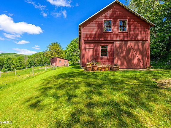Mid-Century Modern aesthetic featuring clean lines, over-sized windows, vaulted ceilings, and an abundance of natural materials such as wood, stone, and brick grace this home. Living room and Dining room have 16' cathedral beamed ceiling. Dramatic foyer greets guests with brick floor and a large decorative Shaker sliding door. Four bedrooms (primary and guest bedroom have ensuite baths) and 4.5 baths provide plenty of space for guests. Walk-out family room on the lower level with stone fireplace. Spectacular views to be enjoyed from every room. This exceptional contemporary home sitting on a quiet country road has 25+ acres for your enjoyment - pond, stream, stone walls. The Timberpeg barn with two box stalls, ample hayloft, and storage on the ground level are ready for your farming needs. Close to cultural and recreational activities in both Columbia and Berkshire Counties.