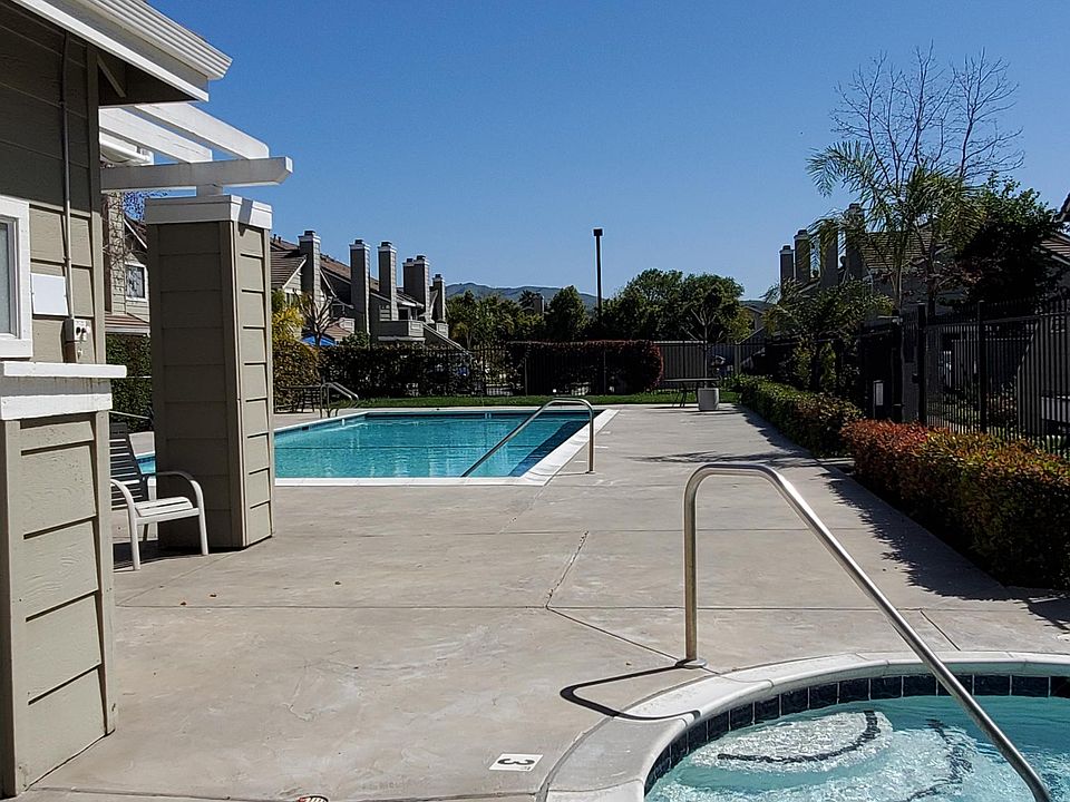 End unit with private patio overlooking the park. Attached one car garage with a parking permit for additional parking. Washer, dryer and refrigerator hook ups, ready for use. Easy access to on site pool and spa. Owner pays HOA which includes water, garbage and grounds maintainence. No dogs, and non smoker please.