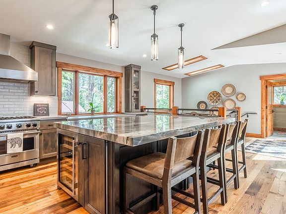 Welcome to 62 Cliff Circle, your ultimate mountain getaway in the heart of Old Mammoth. This stylish four-bedroom, three-and-a-half-bathroom home is where modern luxury meets alpine living - offering a perfect blend of comfort, style, natural beauty, and outdoor adventure. Step inside and be wowed by the gorgeous antique chestnut wood flooring that flows seamlessly throughout the entire home, creating a warm and inviting atmosphere. The kitchen is an entertainer's dream, featuring a stunning Polished Brazilian Ocean Quartzite island and sleek Caesarstone countertops. Features like a Viking eight-burner gas range with double ovens, double Miele dishwashers, a Sub-Zero refrigerator with matching wine fridge and a built-in ice maker ensure you're always ready to host. In addition, there's a Bosch microwave drawer built right into the kitchen island for added convenience. Sunlight floods every room, thanks to the vaulted ceilings, skylights, and large picture windows that offer inspiring views of the surrounding alpine landscape. The bathrooms are luxurious, with elegant stone flooring that adds a touch of sophistication and comfort. Step outside, and your private oasis awaits. The large outdoor spa is perfect for unwinding after a day on the slopes or hiking trails, providing a serene setting to relax and recharge. The detached clubhouse/art studio offers a versatile space where you can unleash your creativity, work on projects, or simply chill out and enjoy some quiet time. This home is being sold furnished, so you can move right in and start living your best mountain life. Every piece of furniture and decor has been thoughtfully selected to complement the home's modern yet cozy aesthetic, making it easy for you to settle in. 62 Cliff Circle is more than just a house...it's a lifestyle. This home offers a unique blend of modern luxury, comfortable space, and natural beauty, providing the perfect backdrop for creating lasting memories with friends and loved ones.