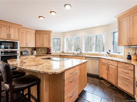 Not a cookie-cutter home, this custom colonial is nestled among natural outcroppings w/in a cul-de-sac, conveniently located south of Rte 1 and only 2 miles from the town Green. An easy elegance in some living spaces, comfortable functional spaces, a recreational resort-like atmosphere, and an abundance of entertaining amenities combine to create a modern lifestyle within a cul-de-sac. Eat-in kitchen offers large center island, granite counter tops, double pantry & and opens to the dining room boasting a see-through gas fireplace w/French doors leading to an expansive wraparound deck and patio. The family room shares the fireplace with the dining room and features built-ins with French doors to a private outdoor deck offering built-in seating. The living room leads to an office/den and a room which functions as a 5th bedroom. The sun-room off the eat-in area of the kitchen provides access to the indoor pool on the lower level via a spiral staircase. There are 4 bedrooms on the second floor with the master boasting a gas fireplace, walk-in closet and full bath with jetted tub and shower. Second bedroom offers an en-suite with tub/shower, while the third & forth bedrooms share a Jack & Jill full bath. Summertime entertaining comes easy with the wraparound deck featuring built-in seating, patio and fenced in area, all overlooking a private setting with natural outcroppings. A nature lover's dream. Close to the beach, shops, restaurants, major highway & commuter rail. Come see! Heated by propane * Tank-less Hot Water Heater 3 years old * Automatic whole-house generator * 14' x 9' indoor pool located on lower level accessed via the sun-room as well as exterior door.