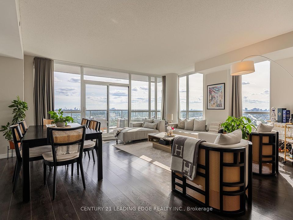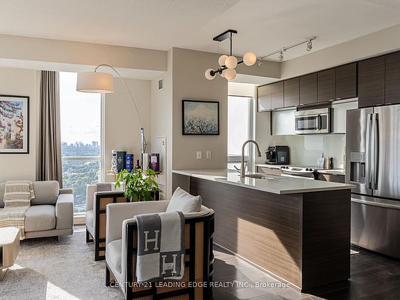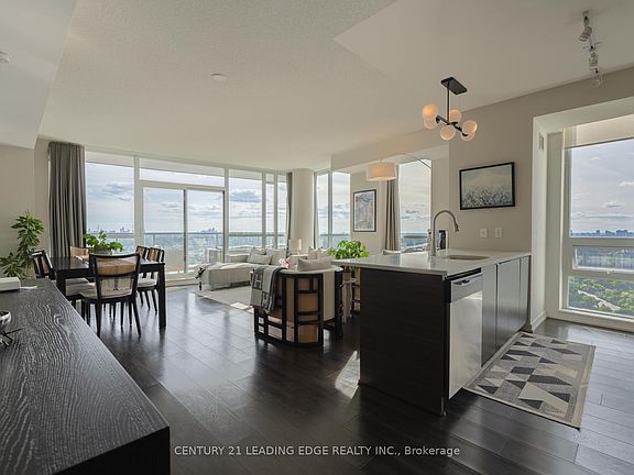 Penthouse perfection with postcard views. This sun-filled southwest corner suite blends 1,209 sq.ft. of refined interior space with a one-of-a-kind 260 sq.ft. terrace for true indoor/outdoor living. Floor-to-ceiling windows, 9' ceilings and hardwood throughout set a modern tone across a smart 2-bed + den layout. The open-concept kitchen elevates everyday cooking with a large breakfast bar, granite counters, undermount sink, glass backsplash, upgraded cabinetry and quality stainless steel appliances. Two stylishly renovated baths feature quartz vanities; the primary ensuite adds a frameless glass shower and a back-lit mirror. The primary bedroom also offers a generous walk-in closet. Thoughtful upgrades include smart-ready lighting/curtains, upgraded frosted-glass doors and two smart thermostats for tailored comfort. The wide, south-facing terrace spans views from the southeast (sunrise) to the southwest (sunset), bathing the home in direct sunlight from morning to evening and framing sparkling skyline views day and night. Practical perks abound: convenient parking space close to elevator, ample storage, direct TTC access from the building, steps to restaurants, groceries stores and Fairview Mall, plus quick links to 401/404/DVP, parks and schools. A rare terrace suite that checks every box: luxury, style, comfort, and convenience in one unforgettable skyline home.