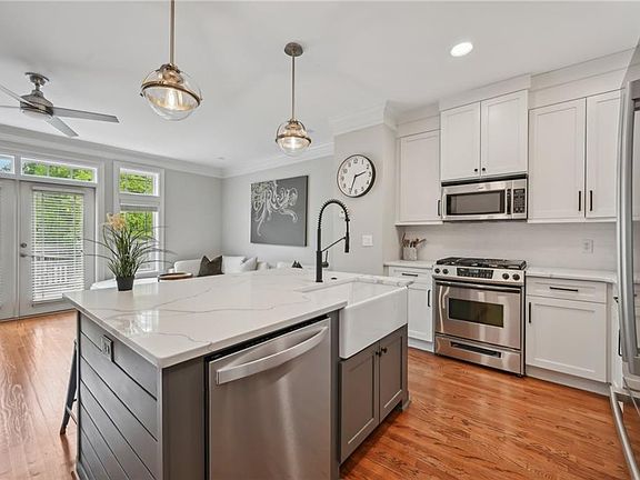 Stunning renovated 3-bedroom, 3.5-bathroom townhome in the heart of Sandy Springs, offering the feel of new construction with thoughtful, high-end finishes throughout. Located in Johnson Creek, an intimate community of just 33 homes, this property is minutes from downtown Sandy Springs, City Springs, top restaurants, shops, parks, and the Performing Arts Center. The chef’s kitchen features custom cabinetry with pullouts and dividers, a large island with farmhouse sink, built-in dishwasher, trash compartment, stainless steel appliances, and a walk-in pantry with sliding barn door. The living room includes custom built-ins, wine rack and fridge, floating alder wood shelves, and a fully redesigned fireplace with marble herringbone surround, shiplap, and alder wood mantle. Main level features gleaming hardwoods and an updated powder room. Upstairs, the oversized primary suite boasts a luxurious renovated bath with white oak cabinetry, vanity station, herringbone tile, a large walk-in shower with waterfall rainhead, dual handheld sprayers, and a large niche—plus a massive custom walk-in closet. A renovated en suite secondary bedroom and expanded linen storage complete the upper level. The terrace level offers a third bedroom or flex space with full bath and direct access to a two-car garage and private parking pad. Enjoy the expansive back deck—your own private outdoor retreat—ideal for entertaining and relaxing. A rare opportunity in one of Sandy Springs’ most desirable communities.