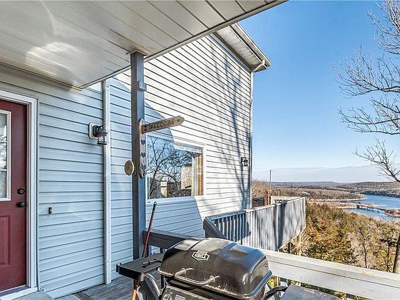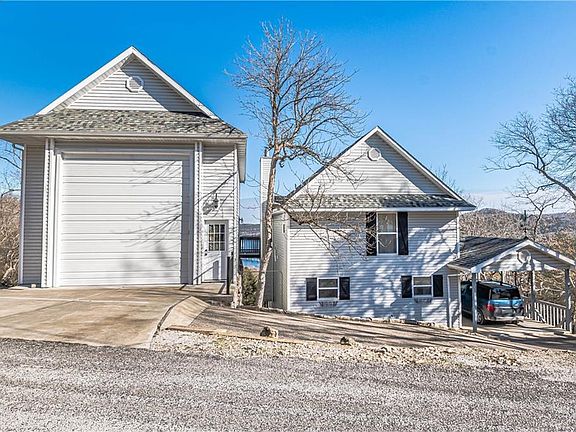 What an EXCEPTIONAL view of Table Rock Lake & beyond from your open concept space by banks of windows on the view wall in the living room, master bedroom, flex space, decks and garage.The 1,100+ sq foot garage with 16' ceiling, 14' x 14' door, 30 amp service, blown insulation in the 2'x6' walls, has ample storage & work bench area too! Home has newer windows,HVAC system,vinyl,carpet, washer/dryer plumbing,water heater & siding.The main level affords the living room that is equipped with a wood burning fireplace and access to 12'x24' deck which wraps to the front carport/parking area. The kitchen, pantry, hall closet, full hall bath and utility room with a closet are also on the main level. The open upper level contains the master bedroom,full bath & walk-in closet with a multi purpose area which then accesses the garage.The lower level consists of the den/bedroom and a workstation with built in oak cabinetry.This home is perfect for any type of occupancy - full time, second home or rental - just bring your toys!