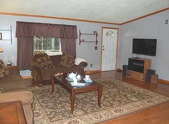 The well- maintained 1,748 sq ft home is sited on a private 2.3-acre parcel near the hamlet of Newfield. Features include an attractive kitchen open to an adjacent dining area w/ pellet stove, a spacious 12 x 18 living room, family room with fireplace, 3 bedrooms, 2 baths (master bath has both whirlpool tub and shower), a private rear deck with hot tub, enclosed breezeway, an attached 2.5 - car garage, above ground pool, fenced yard for pets, and views of surrounding hills.