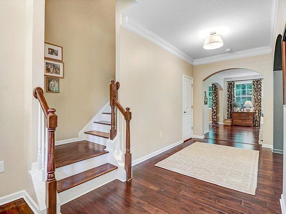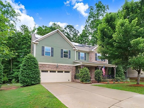 Welcome to this beautifully maintained 3-story home nestled in Peachtree, a GATED COMMUNITY at Flowers Plantation. With 5 BEDROOMS, 3.5 baths, and 3,576 sq ft of thoughtfully designed living space, this home sits on a generous .37-acre cul-de-sac lot backing to a private wooded area — offering space and serenity. From the southern rocking chair front porch, step through the oversized foyer into a light-filled main floor featuring engineered hardwoods throughout. The UPGRADED HOME OFFICE includes custom built-in shelving and cabinetry, ideal for remote work, home school or study. A formal living room with detailed trim and floating shelves adds charm, while the open-concept family room boasts a cozy gas log fireplace, seamlessly connecting to the gourmet kitchen. Cooks will love the gas cooktop, double ovens, walk-in pantry, center island with bar seating, granite countertops, backsplash, and spacious dining nook. *Refrigerator conveys. Enjoy morning coffee on the large deck overlooking your wooded backyard oasis. Upstairs, discover 4 spacious bedrooms with walk-in closets, including a 20x16 primary suite with a spa-like bathroom featuring a soaking tub and tile shower. The third floor offers a private 5th bedroom with full bath and a 20x12 BONUS ROOM — the perfect guest or teen suite. This energy-efficient home includes a 2024 tankless water heater and solar panels for long-term savings and sustainable living. Residents of Flowers Plantation enjoy access to miles of walking trails, community ponds, shopping, restaurants, and more — all within this vibrant master-planned community. Welcome Home!