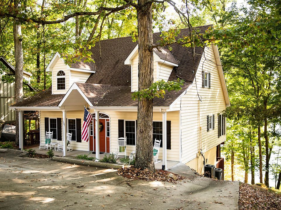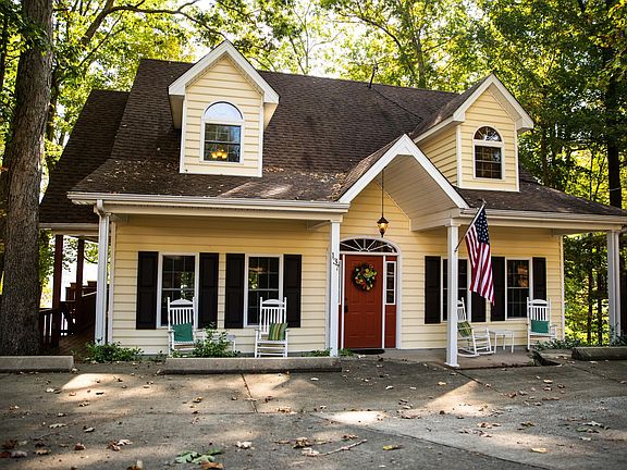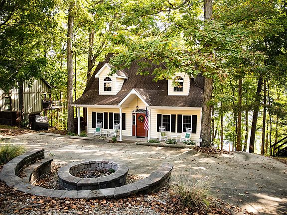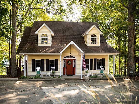 Adorable cape cod with an incredible Nolin Lake view! There are simply not too many properties out there that offer this kind of waterfront view of the lake. Dock is in sight and directly below the house. Features include 3 bedrooms, 2 baths, covered deck, covered porch, concrete path all the way to the red line, granite counters in the kitchen, hardwood floors, and a detached garage for your lake UTV. Tons of concrete! Very little lawn maintenance!
