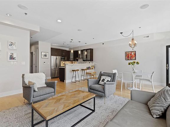 This gorgeous 1285 sq foot 2 bed/2 bath home showcases a lovely open layout and private balcony! Stunning craftsmanship and details throughout, feature a Chef's Kitchen with espresso cabinets, pendant lights, marble backsplash, G.E stainless steel appliances, Silestone countertops and a breakfast bar perfect for entertaining. Spacious sun-drenched living room/dining room with a gas fireplace, Juliet balconies, and surround sound. Other features include central AC/heat, in unit washer and dryer, on demand hot water heater and maple hardwood floors throughout. The master bath features a double-vanity, Kohler fixtures, walk-in seamless glass shower and a linen closet. Just a few blocks to shopping, restaurants, parks, buses, and a 10 minute walk to the Hoboken PATH station.