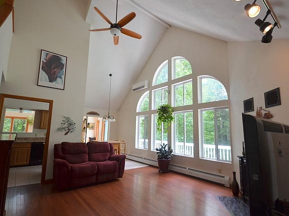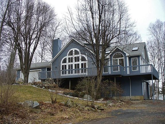 Custom Contemporary home full of windows & light, soaring ceilings & open floor plan. Recently updated kitchen & family room addition that repeats the vaulted ceiling & wall of windows, with charming window seat, all surrounded by "L" shaped expansive deck. Setting is perfect, in popular neighborhood, but 3.57 Acre lot offers privacy & a view that makes you think you have the world to yourself. Need garage space? You have it & then more! 2 car attached garage & additional 2 car garage under addition! Quality finish & extra care in one owner custom build, with white oak floors & fireplace with Vermont Castings Winter Warm system with blowers in living room, plaster finish, AC & central vac. Landscaped exterior with stone walls, paved drive, no detail missed! Limited Lifetime Roof & new composite deck 2015, some replacement windows 2018. Call now for showing!