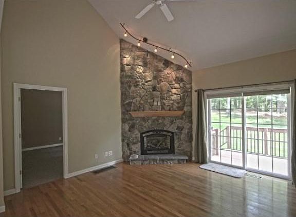 Lovely and spacious 2 bedroom, 2.5 bath Condo in desirable Stage Crossing. Stunning floor to ceiling stone gas log fireplace in living room with vaulted ceiling, hardwood floor and slider to deck overlooking private backyard with wooded border. Formal dining area with hardwood floor and triple window bump out. First floor master with new carpet, vaulted ceiling, 3/4 bath and walk in closet. Freshly painted, fully applianced eat in kitchen off foyer.Second floor den/media room with built in enter