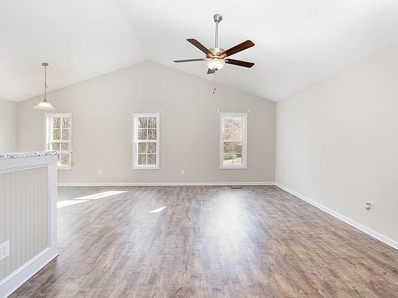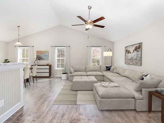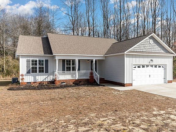 Great open layout ranch plan and large 1.62 acre lot! Ho HOA! Nice rocking chair front porch welcomes you to this culdesac home! LVP floors and Vaulted Ceiling in the Living Room, Kitchen, & Breakfast Area. Open layout lends well to entertainment AND functionality. Refrigerator, Washer and Dryer convey with home. W/D located in hallway. Master BR has tray ceiling & his/hers closets and Master Bath has dual vanity. Deck off kitchen/breakfast area and overlooks private back yard area. Two car, front entry garage.