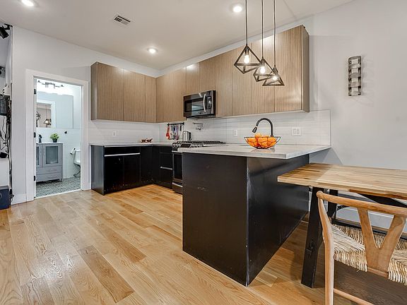 Fall in love with this fully refinished two-family home with a big backyard ideal for the growing family or portfolio. The upper unit offers two-stories, four bedrooms, three bathrooms and private outdoor space while the lower unit is a currently rented, gut-renovated, three bedroom and one bath. The duplex shines with modern upgrades like light oak flooring, well-styled lighting, and ethereal high vaulted ceilings finished with dark wood beams upstairs. Light shines in through gorgeous glass doors into the large eat-in kitchen and dining area. Enjoy the white quartz counters, matte black lower cabinets with contemporary light-wood uppers, stainless steel appliances and specialty wall-mounted pot filler. Step outside to the large wood balcony excellent for entertaining and outdoor living. The second floor hosts an additional family room with two extra bedrooms and bath. Bedrooms give ample closet space, including walk-in closet, while bathrooms are finished with fresh pattern tile, glass showers, floating vanities and matte black fixtures. Property is ideally located on the front side of Bergen Lafayette close to Liberty State Park, Liberty Golf Club and light rail stations for easy NYC access. Jersey City is known for its vibrant community, beautiful parks and excellent access to great schools and surrounding areas.
