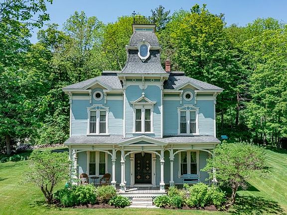 Iconic 1872 Victorian style home with 3,600 sqft on 4.98 acres +/- with green mountain views is perfect to host large gatherings inside or out. Fully renovated in 2014 with many fine features including: a new heating system, updated electrical, updated thermopane windows, and new foam insulation. However, it is still true to its age with many of the original design details: high ceilings, extraordinary period trim details throughout, oversized windows, magnificent double door front entry, and multiple decks. This house has various living options, with a possible studio apartment, 2 kitchens and a kitchenette, 4 bedrooms, two dining rooms, and multiple porches, mountain views, a level lawn and a 2 car garage. Situated in Danby just minutes to Manchester and Rutland. It is being sold partially furnished. All measurements are approximate.