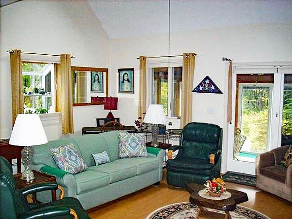 This residence is meticulously maintained and boasts an exquisite sunporch, a three-season room, and an expansive outdoor deck. Additionally, it features a shed, numerous fruit bushes, and a breathtaking view of the mountains. Furthermore, the property includes a second vacant lot measuring 2.6 acres, which adjoins the main property, all encompassed within the listed price.