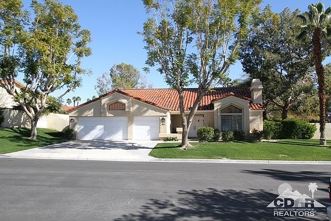 This 3 bedroom 2.5 bath home is no less than Beautiful! - Architectural Features beyond the Coffered Ceilings & tons of light in all the Living Rooms.Located on an elevated corner lot with Mountain Views & lots of Privacy. The outside is well landscaped for color & low maintenance. The Spa keeps water hot@ 104 degrees for less than $2/day. Rosewood Floors are accented with light gray walls and white baseboards -- making a truly dramatic effect & impressive sense of arrival once through the tall double doors.The Corian Kitchen has a center Island & easy access to family room & Breakfast area. Master Suite has oversized bath, jetted tub,large windows & generous walk-in closet. Second Guest room also has walk-in closet & sliders to the outside.Full 3 Car garage, Instant Hot Water system throughout, 2 Fireplaces, Formal Dining Room & 2544 Sq ft are just some of the great features.San Marino is an upscale 66 Home Community across from Mission Hills CC. HOA includes front landscaping & cable.