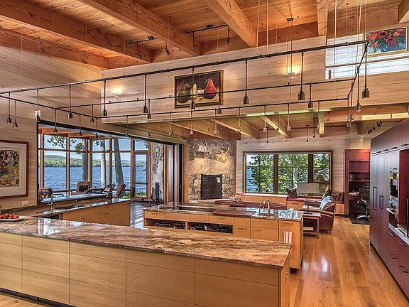 Truly one of the finest lake estates in Maine, Crescent Point provides stunning westerly views over Long Lake to the White Mountains beyond. This very special offering consists of 48± private acres with 1507' of lake frontage, including 2 expansive crescent-shaped sand beaches and 3 docks. The architecturally designed main residence was thoughtfully planned and carefully completed in 2013 with not only the finest materials but also the most unique. The sun-filled home has a spacious first-floor master suite and 2 private guest quarters on the second level, accessed by separate stairways. The masterfully designed Great Room, with its high beamed ceiling and sculptured granite fireplace, incorporates a spectacular kitchen and opens to the oversized screen porch with a set of custom sliding glass doors that sits just at the water's edge, offering an ideal floor plan for entertaining. In addition to the main residence, there are 2 charming 1950's updated cottages, just the right distance from the main residence, each with 3 bedrooms, full kitchens, stone fireplaces and decks with views of the lake. A wonderful family compound accessed by its own long, winding private drive, this property truly has it all.