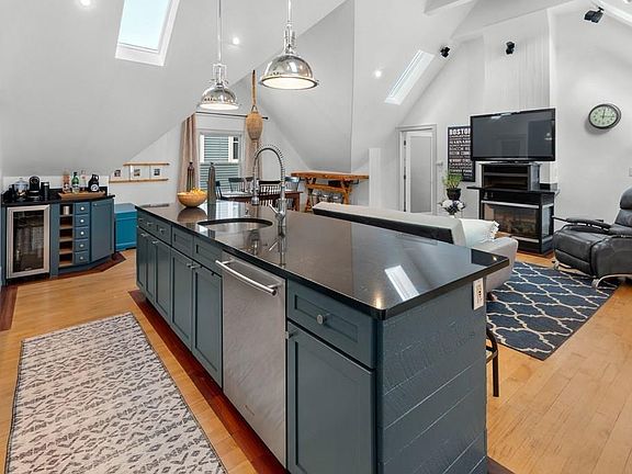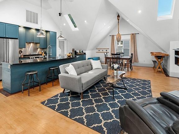Perched high on Jones Hill this unique penthouse offers incredible views of Boston Harbor and the surrounding cityscape. This 2 bed, 2 bath condo features soaring vaulted ceilings with skylights, dramatic architectural angles, gas fireplace, Bose speakers, and an open floor plan perfect for entertaining. The primary bedroom features an ensuite bath with a large tiled shower and a Juliet balcony- Open the French doors and enjoy incredible sunrises and the fresh ocean breeze. There are 2 private outdoor spaces, a side balcony and large private back deck. This unit is complete with In-unit laundry, 2 off street parking spaces, a full walk-out basement with plenty of private storage. The association grounds is meticulously maintained offering a private botanical oasis with pear trees, a beautiful perennial garden, berries, and milkweed that attracts the fall monarchs. Easy access to Rt 93, the Savin Hill T Station, restaurants, shops and the upcoming DOT Block development.