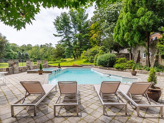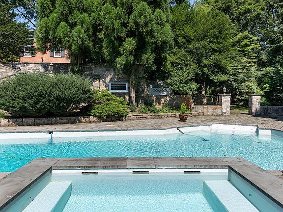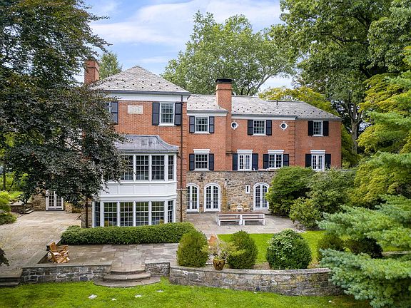 True Georgian Colonial. Breathtaking approach. Red Gravel Courtyard. Stone wall Slate roof as well as slate roof detached 4 car garage. 7 Working Fireplaces Large Pool Pool House with Bathroom Tennis Court Cottage with bathroom Slate roofs on main home and garage/cottage Manicured lawns in from and back of compound.