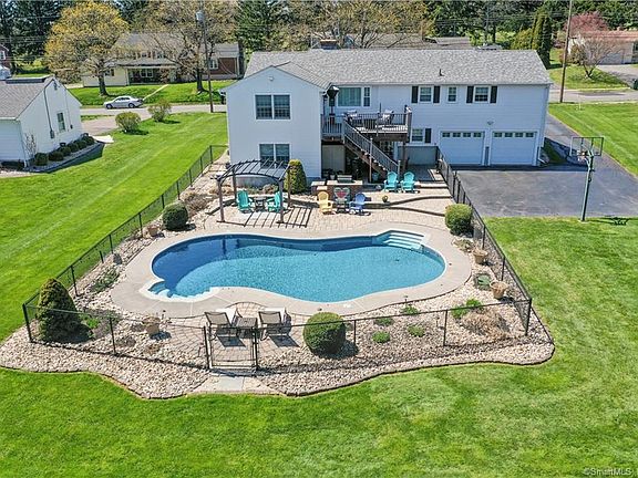 If you are looking for your Dream Home with great curb appeal & in meticulous condition inside & out, look no further. You have arrived at 62 Surrey Drive in historic Wethersfield CT. Not your typical Raised Ranch, this Georgian-inspired sprawling home offers 2975 sq.ft. of living space on a fabulous level half-acre lot on a cul-de-sac in the Highcrest School district. Upon entering you'll feel the vibe of Farmhouse chic coupled with Classic design and modern color trends. Impressive Entry Foyer boasts of extensive millwork. Gleaming hardwood floors on entire main level. Kitchen offers granite counters, custom cabinetry, dining area & crafted stone wall w/fireplace. Formal Dining Room is banquet-sized w/built-in granite-top buffet server. Home office connects to Kitchen. Gorgeous Year 2004 rear Family Room addition w/French slider doors to deck. Main level is complete w/Full Main Bath & 3 bedrooms inclusive of Primary Bedroom Suite w/remodeled Bath & walk-in closet. Lower level leads to yet another expansive Family/Theater Room w/Fireplace, Half-Bath, 4th Bedroom w/walk-in closet, laundry room & plentiful storage. Lower level French slider doors lead to Patio & very special backyard that equates to a true "Staycation". Dreamy Free Form heated salt-water inground pool is surrounded by high-end masonry landscaping, safety fence, Pergola, Gas Grill & lovely plantings. CAIR, thermal windows, newer roof & mechanicals, 2-car rear-entry Garage. 62 Surrey Drive is awesome!