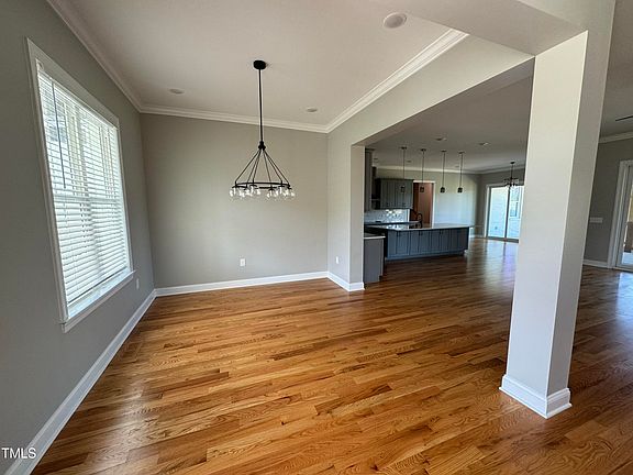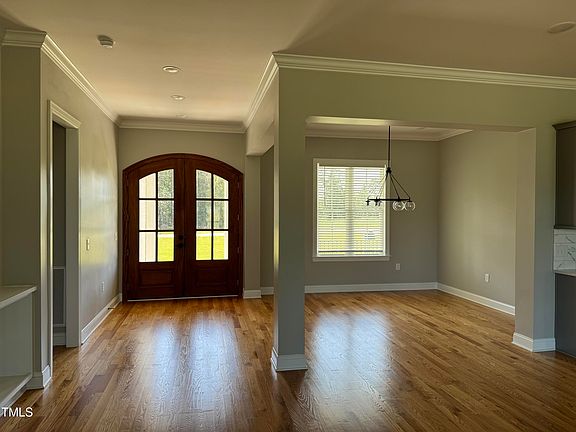 This expansive 5-bedroom 4 1/2 bath home offers the perfect blend of luxury and privacy on a tranquil 1.49-acre lot. Step onto the rocking chair font porch and through the grand arched front doors into a welcoming open living space with hardwood floors, delightful fireplace and a gorgeous view of the 392 sq. ft. expansive back covered porch and a concrete finished patio for additional outdoor living enjoyment. and large gatherings. Large cooks' dream kitchen with quartz countertops, double ovens, and 2 large pantries. Breakfast area offers natural lighting with large sliding doors and entrance to the back covered porch. First floor main bedroom with gorgeous walk-in rain shower and garden tub and private water closet. Spacious dressing room closet. Comfortable living space throughout with oversize upstairs great room and exercise or playroom. Additional storage in walk-in attic space. Side-entry 3-car garage with additional driveway parking and spacious laundry room. Home is located minutes from Knightdale, Raleigh, Rocky Mount, and other major highways. Peaceful country living with modern luxury and space for families and large gatherings.