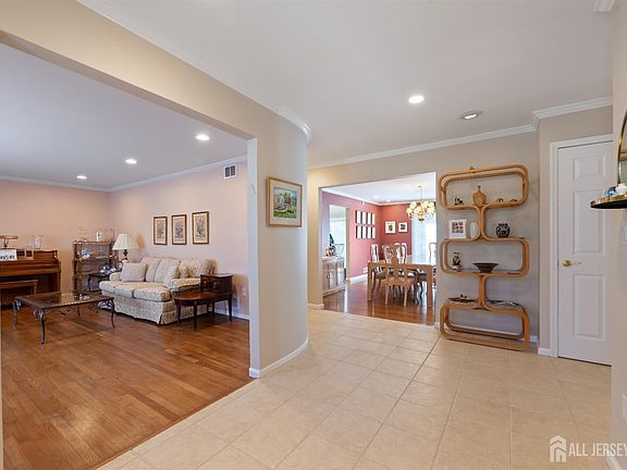 Exquisite 5-bedroom, 5.5-bathroom home in the sought-after Colonial Oaks community is a masterpiece of design and craftsmanship. Thoughtfully curated for elegance and functionality, it features hardwood floors, crown molding, recessed LED lighting, and European designer tile. Anderson windows with Hunter Douglas treatments enhance its charm. Step into the grand foyer and experience the seamless flow of this remarkable home. The spacious living room and banquet-sized dining roomcomplete with French doors opening to a retractable screen leading to the deckcreate the perfect setting for entertaining. The chef's kitchen has custom oak cabinetry, deep designer drawers, granite countertops, and premium S/S appliances, including 3 ovens, one being a GE Advantium. Large center island and casual dining area add style and practicality. The inviting family/great room features soaring vaulted ceilings and stunning marble gas fireplace with remote control. The family wing offers luxurious primary suite with a double-tray ceiling, expansive walk-in closet, and direct patio access. The spa-like en-suite bath showcases tumbled marble walls, limestone floors, soaking tub, oversized shower, and separate water closet. Custom vanity with granite countertops adds elegance. This wing also has 3 spacious bedrooms, 2 full baths, and laundry room with a brand-new washer and dryer. Barrier-free paver walkway leads to the side entrance, opening into a sunlit second foyer with Velux skylights and electric shades. From here, enter the thoughtfully designed guest wing, featuring spacious second primary bedroom with accessible en-suite bath and barrier-free shower. This wing also has a bright sunroom with ceiling fan, a kitchenette, and powder room. Independent heating and air conditioning ensure comfort. Expansive walk-out/up basement offers high ceilings, full bath, kitchenette with maple cabinets and granite countertops, column-free recreation room supported by steel beams, office with built-in shelves, second laundry room, and abundant storage. Step outside to your private oasis. The professionally landscaped backyard features mature trees, perennial gardens, natural stone walkways, and a 10-zone sprinkler system with a new timer control box. A spacious deck, paver patio, and scenic walkways provide the perfect setting for outdoor relaxation, all backing to Green Acres for ultimate privacy. Additional features include Cambridge pavers on the front walkway and porch, four heating and cooling zones, a brand-new roof (2 years old), extra-wide gutters with gutter guards, a hard-wired security system, and an updated sprinkler system. Easy access to major highways, Downtown New Brunswick, Rutgers University, and top medical facilities. Conveniently located near houses of worship, NYC buses, shopping, dining, and recreational amenities. East Brunswick Award-Winning Blue Ribbon Schools!